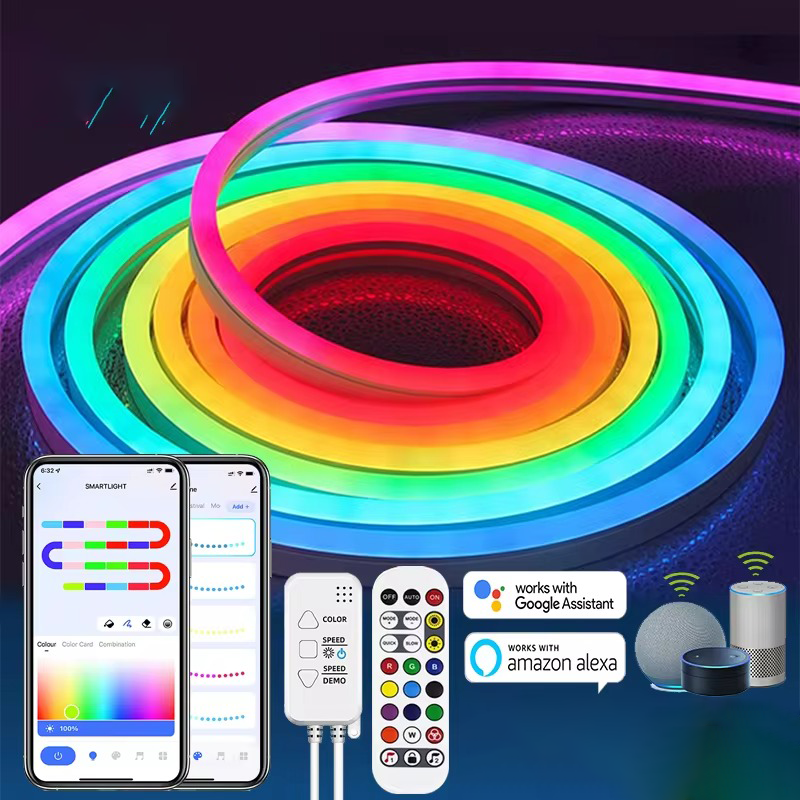 Enhance your room with Neon LED Strip Lights featuring Music Sync and RGBIC Dream Colors, perfect for creating an immersive atmosphere. This TUYA-compatible silicone rope lighting operates on 12-24V and offers vibrant, customizable colors with 84 LEDs per meter.